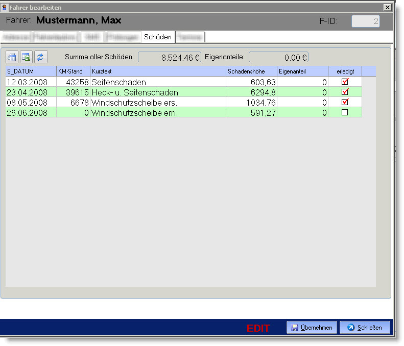 Schäden Im Register Schäden werden alle Schäden des Fahrer unabhängig vom Fahrzeug chronologisch aufgelistet.