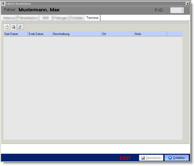 Im Register Termine werden alle Kalendereinträge (Einsätze aus der Option Fahrzeugkalender oder Fahrzeugdisposition) des Fahrers aufgelistet.