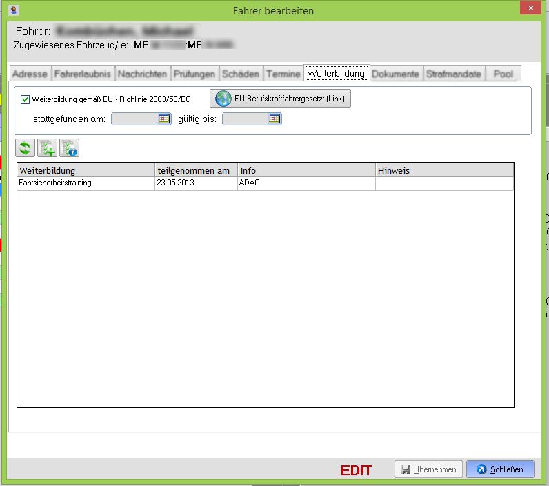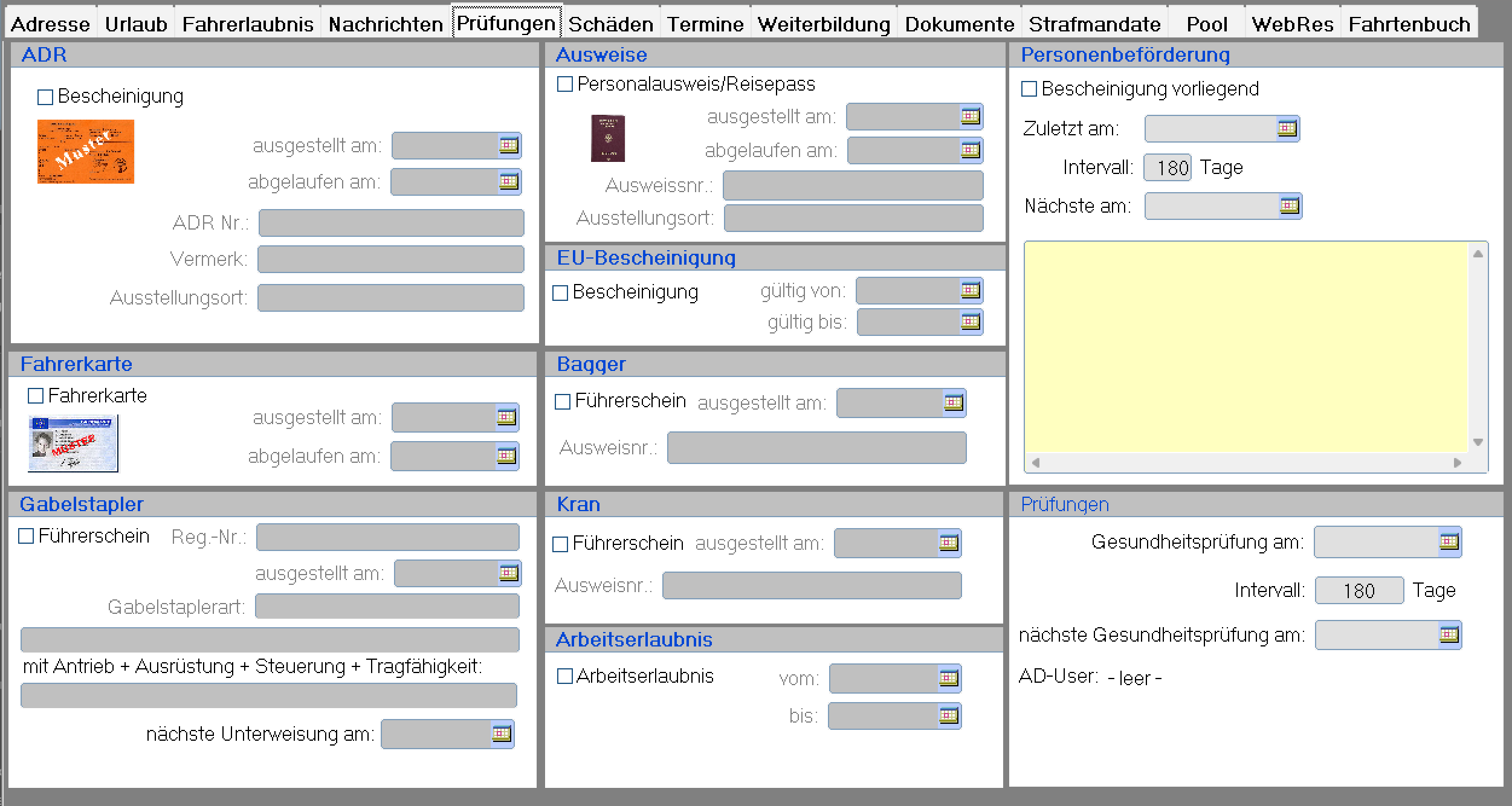 Im Register Prüfungen können die fahrerspezifischen Prüfungen eingetragen werden.