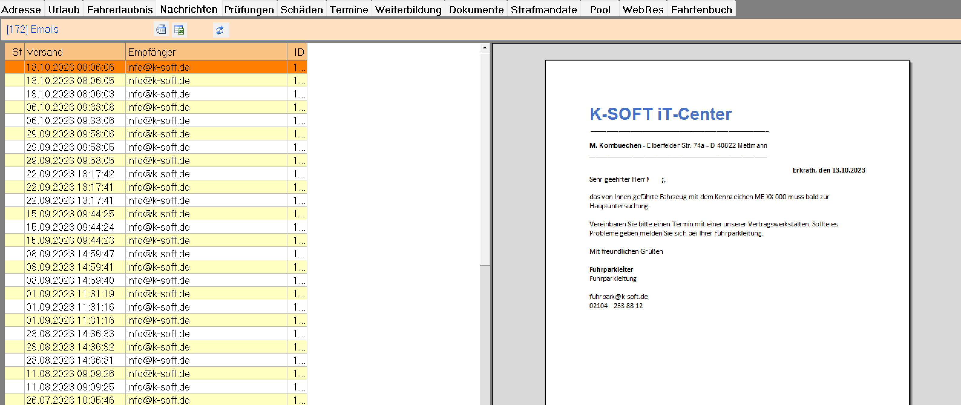 Der Flottenmanager kann E-Mails aus der Datenbank an einen internen oder externen E-Mailserver versenden.