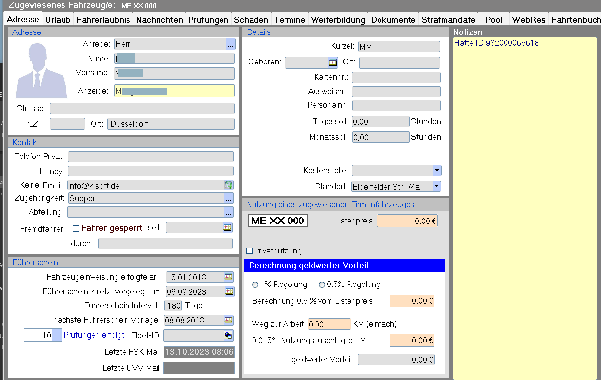 Hinterlegen der Adress- und Kontaktdaten inkl. Geburtstag, Telefon privat. Eine Besonderheit sind die beiden Felder Tagessollstd. und Monatssollstd.. Diese Daten werden für das Zeiterfassungsmodul FAZ (Fahrer-Zeit-Erfassung- und Berechnung) benötigt. Über die Felder Handynummer (für den SMS-Versand) und Email können dem Fahrer Nachrichten zugestellt werden.