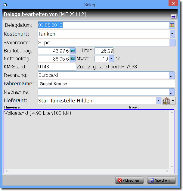 Darunter befinden sich weitere Informationen zum Tankvolumen des Fahrzeuges und des Durchschnittsverbrauches auf 100KM. Sofern der Beleg per Tankkartenimport in die Datenbank gelangte stehen hier (abhängig vom Hersteller) Informationen zum Ort, dem Hersteller und der Warensorte.