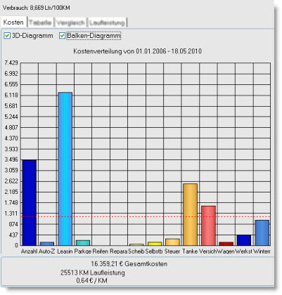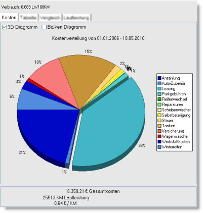 Hier werden alle in der Tabelle aufgelistete Belege in grafischer Form als 3D- oder Balken- Diagramm prozentual aufgeführt. Alle Kostenarten werden in entsprechender Farbe rechts daneben aufgelistet. Es besteht die Möglichkeit mit einem rechten Mausklick die Grafik in die Zwischenablage zu kopieren.
