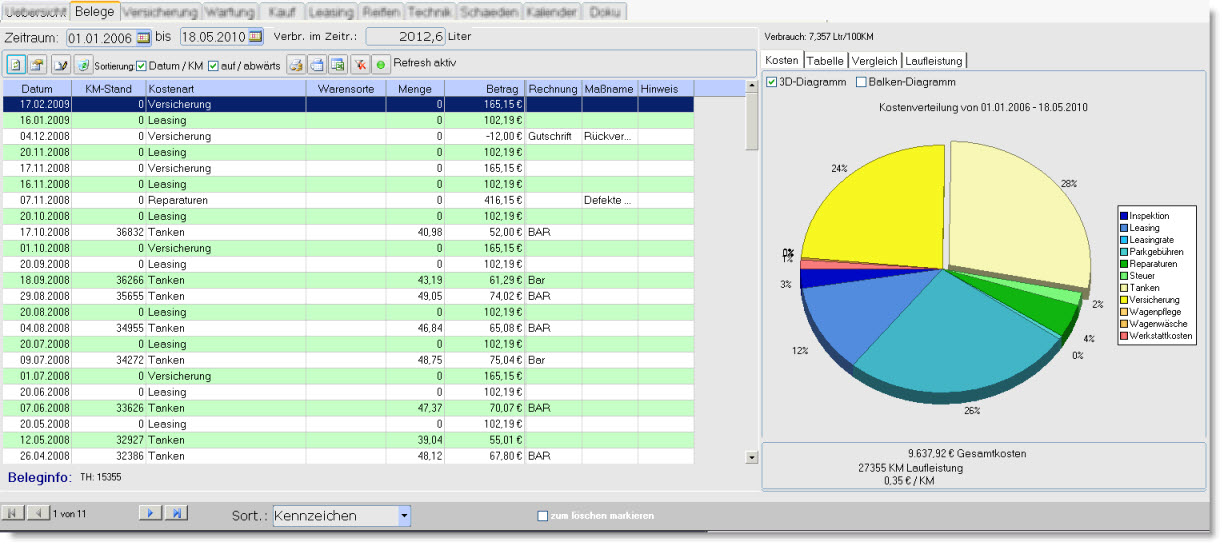 Im Tabulator & Register Belege werden alle erfassten Belege im eingestellten Zeitraum aufgeführt. Im Bezug auf den Zeitraum werden alle getankten Liter Kraftstoff, der Durchschnittsverbrauch auf 100 KM und die Detail-Informationen (rechts) berechnet und angezeigt.