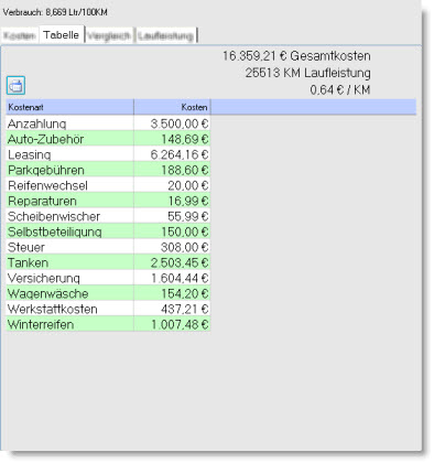 Die Kosten und deren Verteilung, können auch in Tabellenform angezeigt, ausgedruckt und nach Excel exportiert werden.