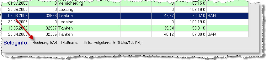 Durch einmaliges Anklicken eines Beleges, werden Detailinformationen zum Beleg in der Statuszeile unterhalb der Liste ausgegeben.