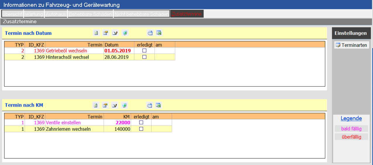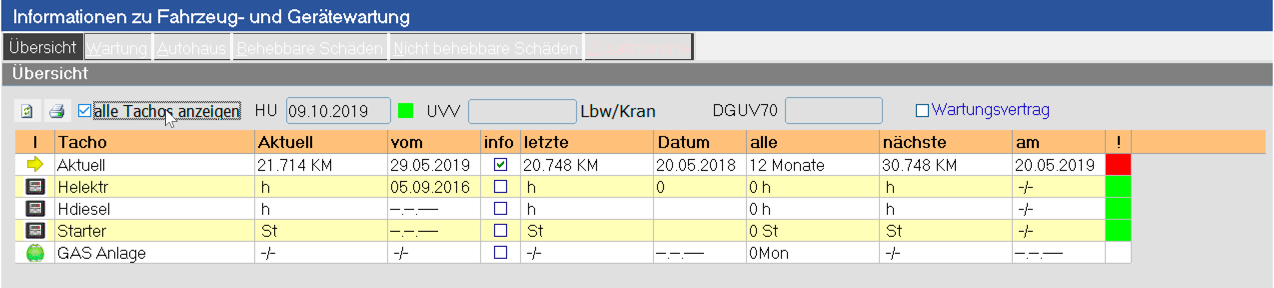 Die wichtigsten Termine (HU, UVV Lbw und DGUV70) werden hier eingeblendet und sich nicht editierbar!
