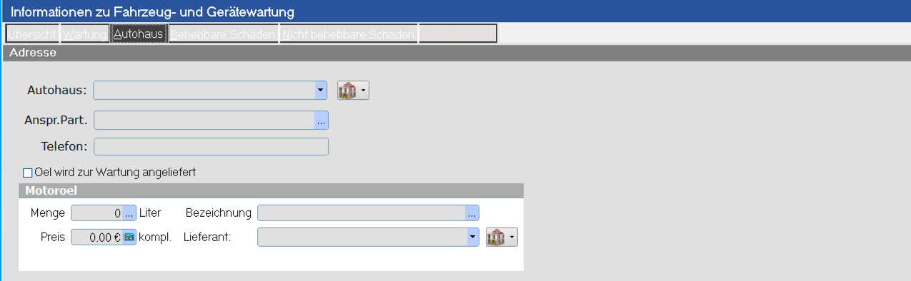 Der untere Bereich gibt bei Bedarf die Möglichkeit Informationen zu hinterlegen, ob Motor- oder Getriebeöl der Werkstatt angeliefert wird und deren Information wo, mit welcher Artikelnummer und zu welchem Preis dies zuletzt bezogen wurde.