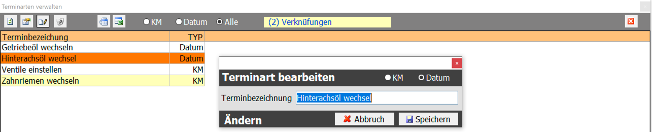 Über den Button [Terminarten] (rechts) können Sie eigene Termine für KM und Datum festlegen!