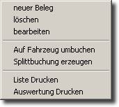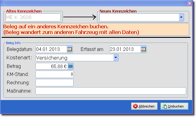Die Belegumbuchung bucht den markierten Beleg weg auf ein anderes Fahrzeug. Anwendung diese Funktion nur bei falsch erfassten Belegen die nicht zu diesem sondern eine anderen Fahrzeug gehören.