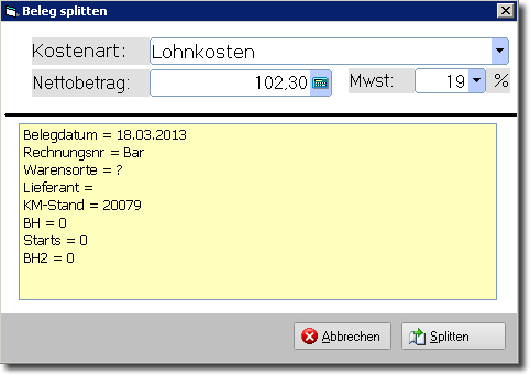 Die Splitbuchung nimmt basierend auf den vorhandenen markierten Beleg eine Kopie auf ein andere Kostenart vor. Hierbei werden die Rechnungsdaten komplett übernommen und nur die Kostenart und der Betrag geändert bzw. erfasst. Auf diese Weise können zuerst Materialkosten und anschließend Lohnkosten einer Werksattrechnung effektiv und schnell erfasst werden.